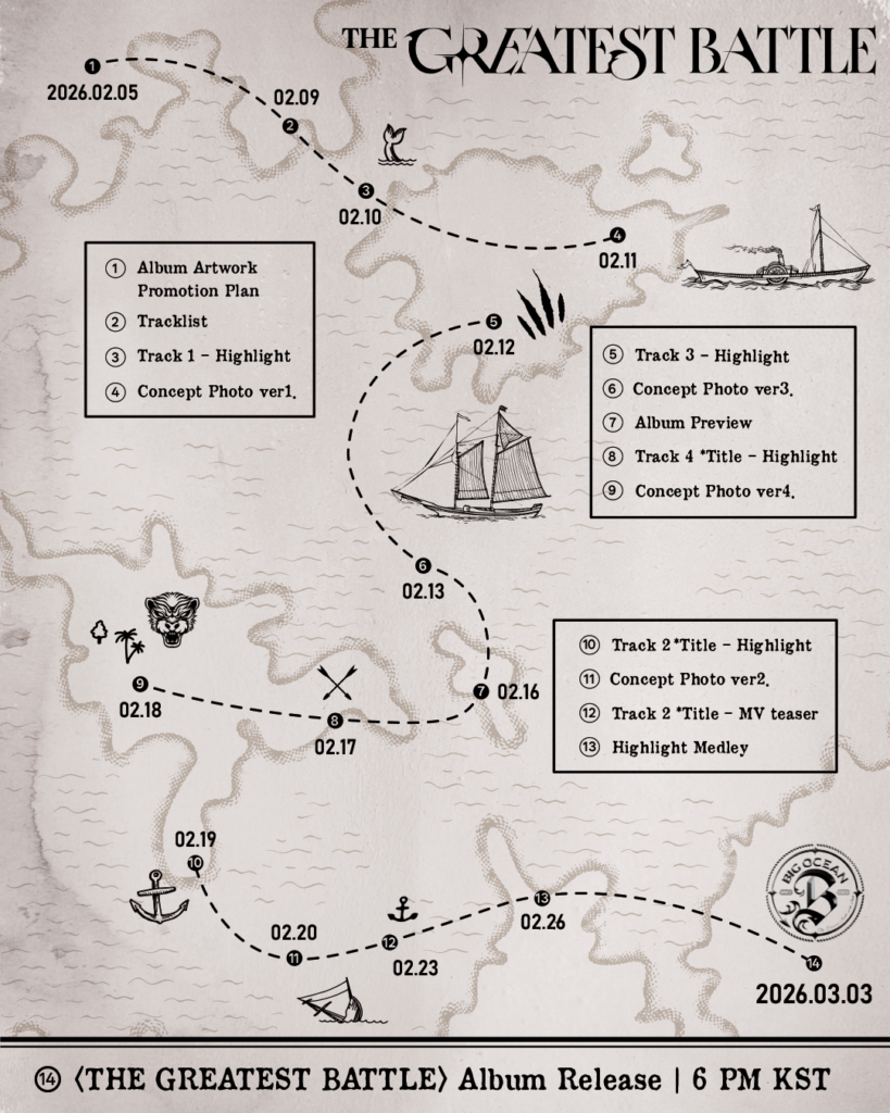 En la imagen principal de “THE GREATEST BATTLE”, Big Ocean destaca con poses decididas y un estilismo casual en tonos negros, proyectando una presencia fuerte y carismática. Detalles como la tela en movimiento y las inscripciones grabadas en el suelo han despertado la curiosidad de los fans, quienes ya especulan sobre el concepto y el mensaje que el grupo presentará en este nuevo lanzamiento.