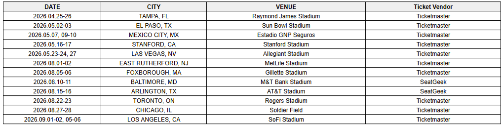 Por ahora, la información confirmada para México es: Conciertos: 7, 9 y 10 de mayo de 2026 en el Estadio GNP.