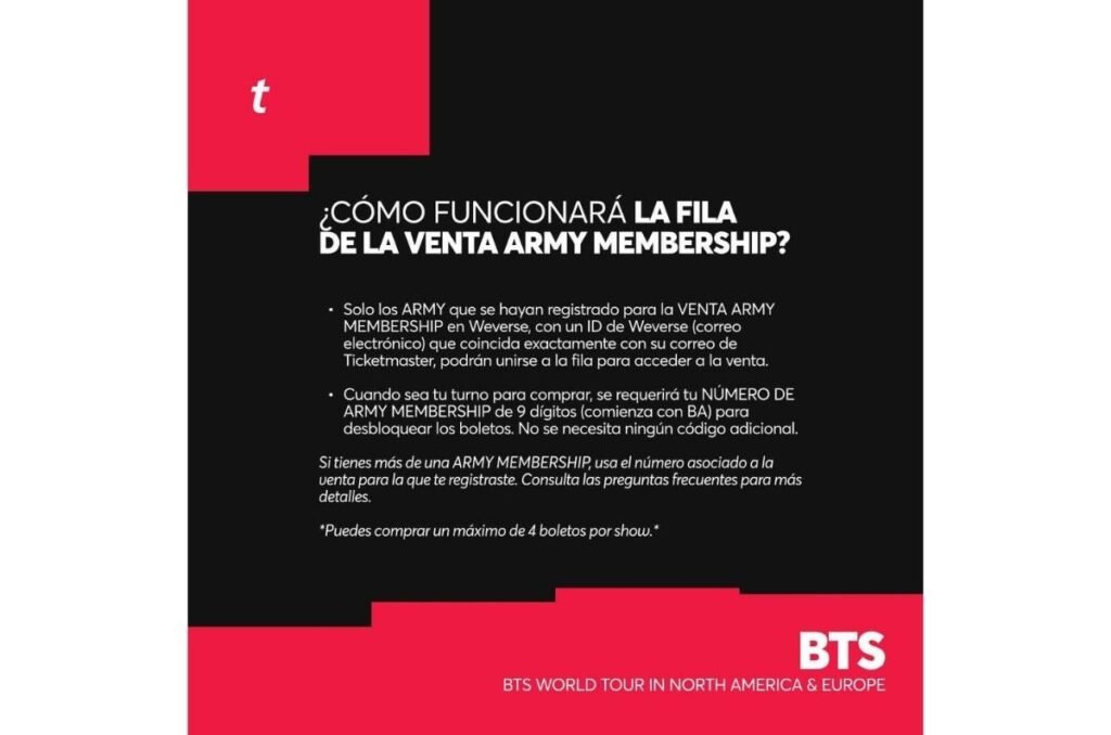 Cada número ARMY Membership puede comprar un máximo de 4 boletos por show.